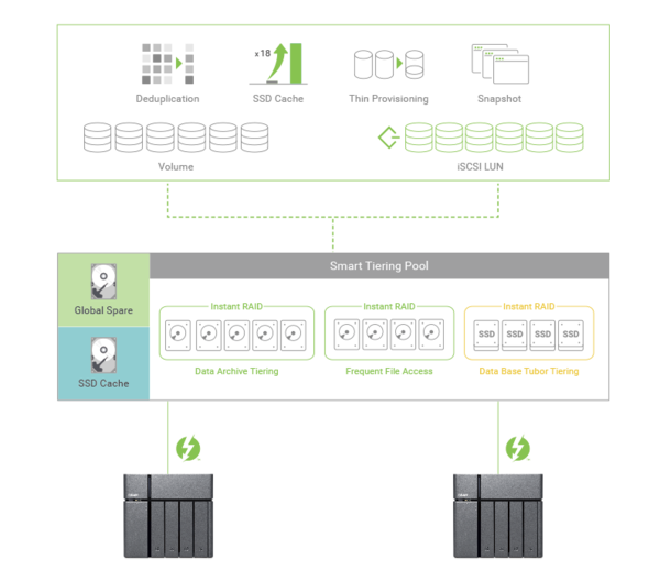 | Управление дисками | Единичный диск, RAID 0, 1, 5, 6, 10, 50, 60 и JBOD Много томов и пулов хранения Тип пулов: Универсальный, для медиа-контента и для баз данных Расширение пула/тома online Оповещение о заполненности пула/тома Кэш на запись для пула Проверка пула Преобразование клонов в тома Виртуальный том Возможность извлечения и замены диска HDD S.M.A.R.T. Встроенный iSCSI target и initiator service Управление внешними устройствами Глобальные диски и диски горячей замены Мгновенное создание RAID и быстрый ребилд Auto Tiering SSD кэш на чтение и запись Дедупликация (том и LUN) Мгновенные снимки (папка и LUN) Сжатие (том и LUN) Thin Provision для LUN |