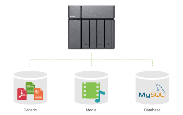 Уникальный дизайн корпуса системы делает XCubeNAS универсальным гибридным устройством хранения. XCubeNAS имеет отдельный слот для SATA SSD с левой стороны, который не влияет на возможность использовать основные два слота для дисков. В результате больше нет необходимости в компромиссе между емкостью и производительностью.