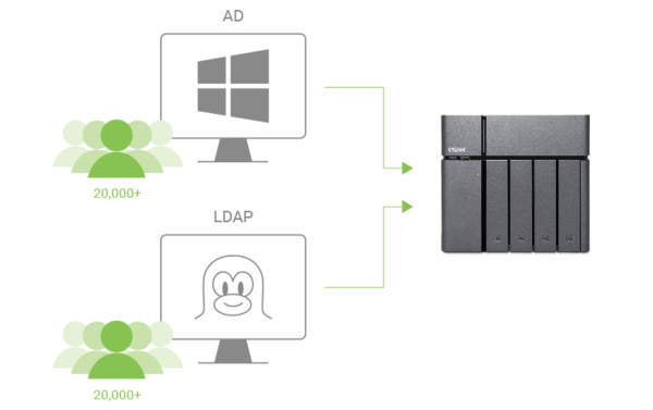 XN3004T имеет интеграцию с Windows AD и LDAP. Поддерживается до 200000 доменных учетных записей с автоматическим созданием домашних каталогов, избавляя тем самым IT администраторов от рутинных действий по назначению прав к общим ресурсам.