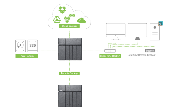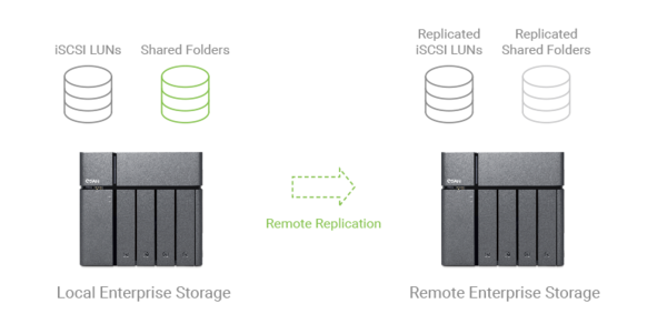 Данные могут копироваться на удаленные системы хранения в режиме реального времени. Периодическое копирование данных на иной NAS, расположенный в другом офисе, позволит увеличить сохранность данных на случай сбоя.